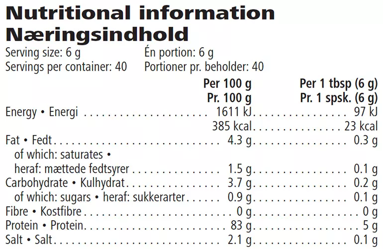 Każda porcja (6 g proszku) dostarcza 5 g czystego białka, co pozwala na bardzo precyzyjne dopasowanie ilości protein do indywidualnego zapotrzebowania organizmu.
