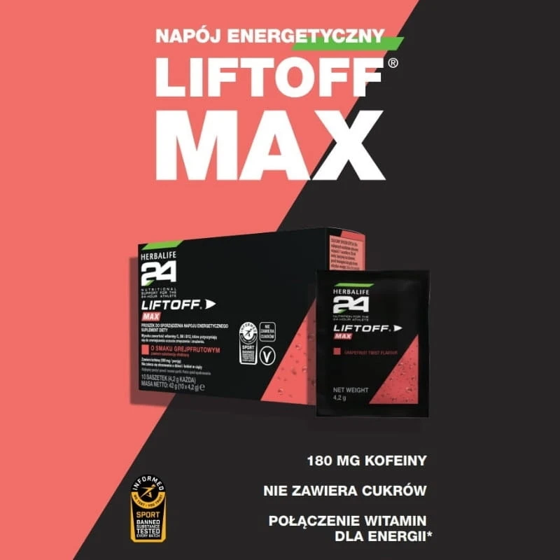 Herbalife24® LiftOff® Max to Twój klucz do osiągnięcia maksymalnych wyników. Pozwala cieszyć się długotrwałą energią i jasnością umysłu, dbając jednocześnie o zdrowie i bezpieczeństwo antydopingowe. Podkreśl swoje profesjonalne podejście do sportu i poczuj różnicę już przy pierwszym treningu.
