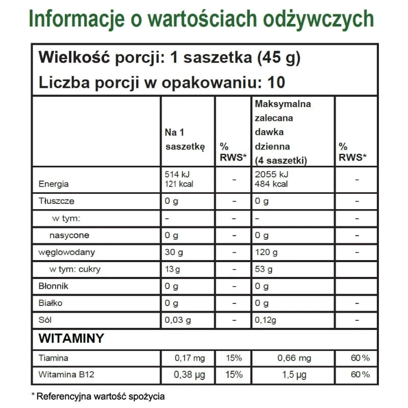 - Przed treningiem: Spożyj jedną saszetkę na 15-30 minut przed startem, aby nasycić organizm szybko dostępnym paliwem.