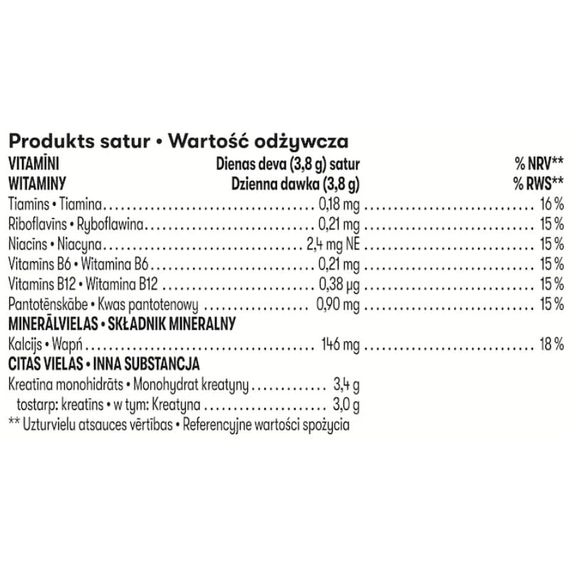 Każda porcja (3 g) dostarcza 3 g czystego monohydratu kreatyny, co jest optymalną ilością zalecaną przez ekspertów w celu uzyskania korzystnego działania suplementacji.