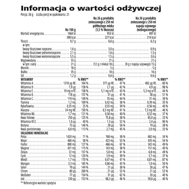 - Produkt Bezglutenowy i Wegański - Formuła opracowana tak, by odpowiadać na potrzeby osób z nietolerancjami oraz na diecie roślinnej (przy przygotowaniu z napojem sojowym).