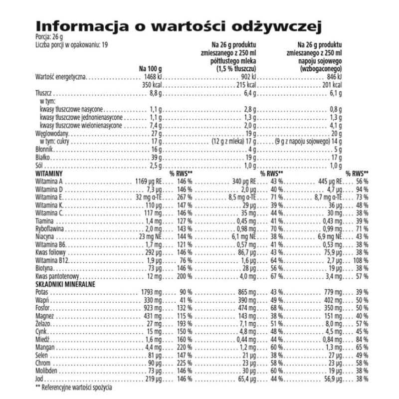 Opakowanie o gramaturze 500g pozwala na przygotowanie 19 pełnowartościowych posiłków przy zachowaniu standardowej wielkości porcji wynoszącej 26g.