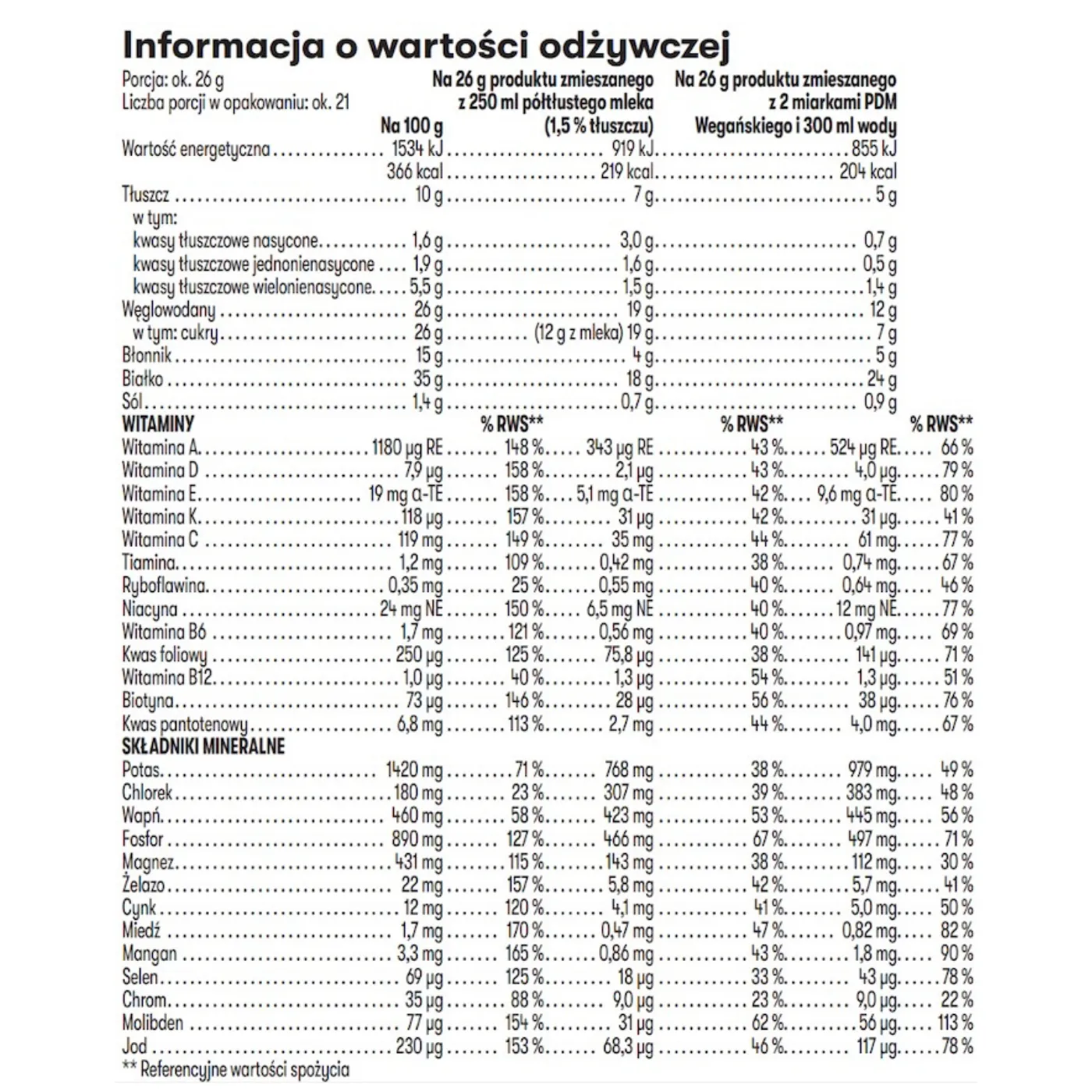 Jedno opakowanie zawiera 21 porcji produktu, przy założeniu stosowania standardowej dawki wynoszącej 26g proszku na jeden posiłek.