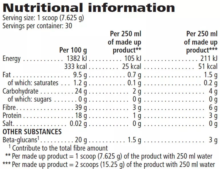 Jedna miarka dostarcza 1,5 g beta-glukanów, a dwie miarki (porcja zalecana dla uzyskania efektu obniżenia cholesterolu) dostarczają pełne 3 g tego cennego składnika.