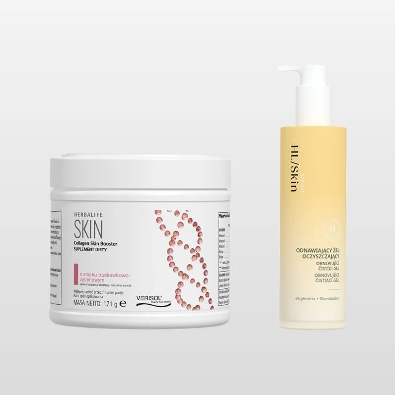 Ten zestaw pielęgnacyjny łączy wsparcie od wewnątrz z nowoczesną pielęgnacją zewnętrzną. W jego skład wchodzą dwa produkty: Collagen SKIN Booster (suplement w proszku) oraz HL/Skin Odnawiający żel oczyszczający (147 ml).